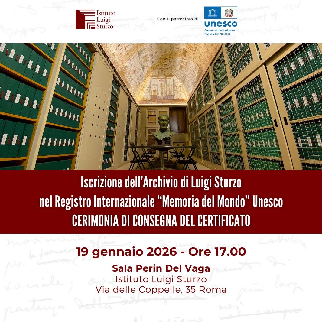 Il 19 gennaio 2026 alle ore 17 presso la sede dell’Istituto Luigi Sturzo a Roma si terrà la Cerimonia di consegna del Certificato per l’iscrizione dell’Archivio di Luigi Sturzo nel Registro Internazionale Memoria del Mondo dell’Unesco, deliberata dal Consiglio Esecutivo dell’Unesco riunitosi l’11 aprile 2025 a Parigi. Alla Cerimonia interverranno: Nicola Antonetti (Presidente Istituto Luigi… Continua a leggere Iscrizione dell’Archivio Luigi Sturzo nel Registro Internazionale “Memoria del Mondo” Unesco – Cerimonia di consegna del Certificato