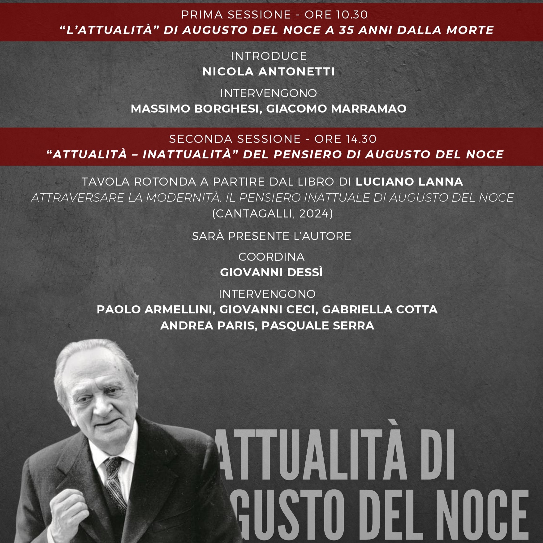 In occasione dei 35 anni dalla sua morte, l'Istituto organizza una giornata di studio su Augusto Del Noce, pensatore “inattuale” e “scomodo” che ha offerto intuizioni di grande rilievo per comprendere la realtà contemporanea nei suoi diversi aspetti. Alcuni dei maggiori studiosi del suo pensiero, anche a partire dal recente libro di Luciano Lanna, Attraversare… Continua a leggere “L’attualità” di Augusto Del Noce – Giornata di studio